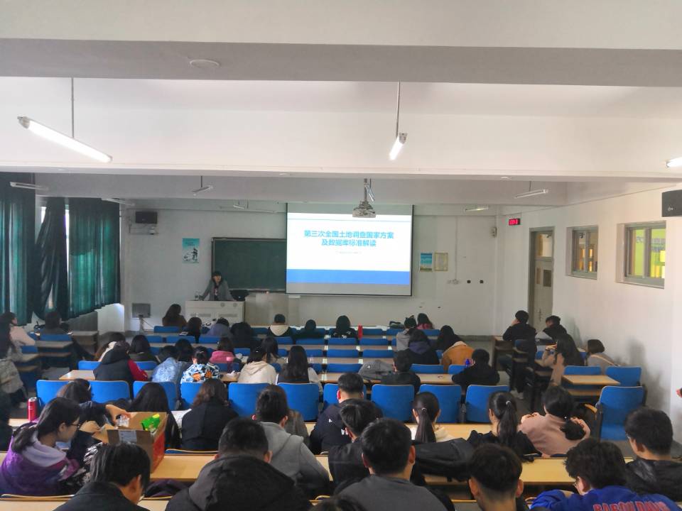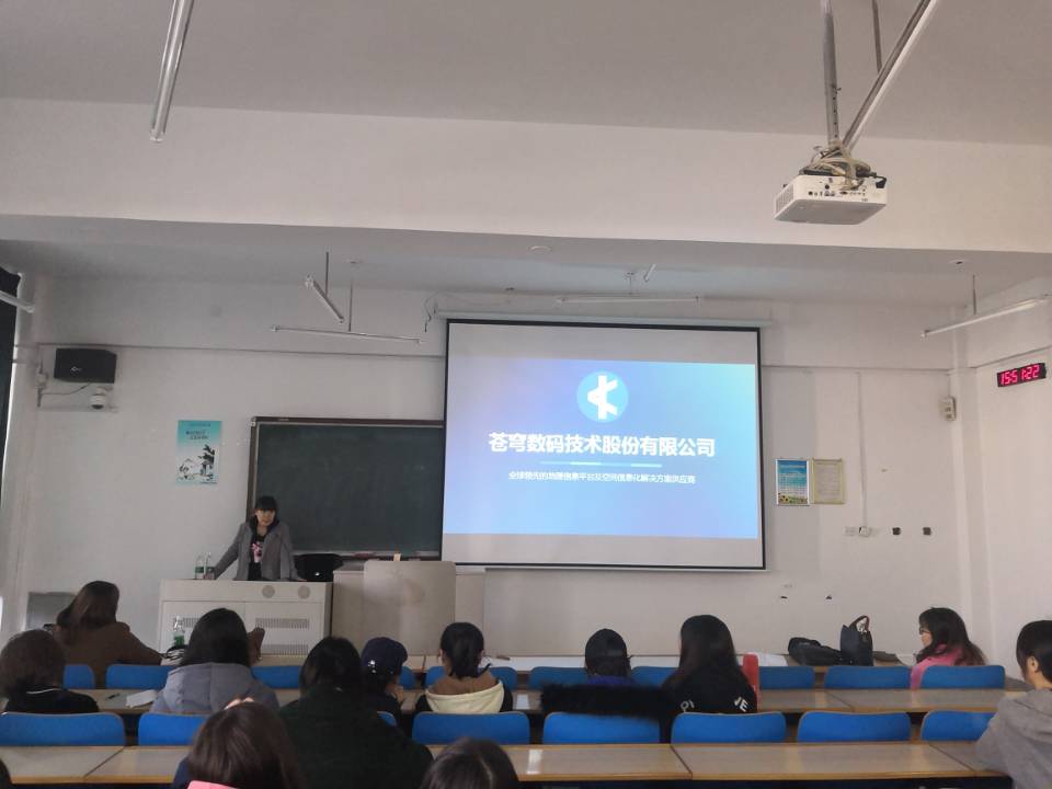 学生工作的大力支持表示感谢,同时也希望同学们能够借此机会参与到第三次全国土地调查中来,提高操作能力、巩固理论知识。北京苍穹数码技术股份有限公司沈阳分公司主管刘海燕为同学讲述了公司简介、业务范围、基础平台等内容并着重介绍了公司在第三次全国土地调查中的任务,,并就同学们所提出的疑问进行了解答。