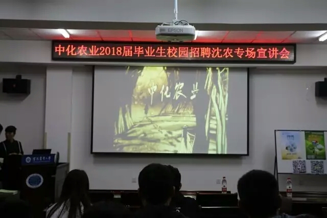 现就职于中化农业的毕业生师兄杨振西分享经验与成长经历;就业该公司的学长学姐们通过视频向同学们介绍中化农业,欢迎学弟学妹们加入;通过视频向同学们展示公司员工平日多彩活动;最后,进行总结,该宣讲会就此结束。
