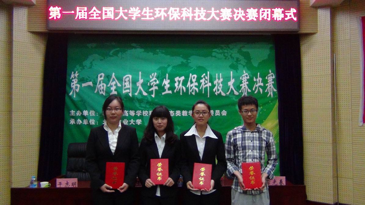 首届全国大学生环保科技大赛是由教育部高等学校环境生态类教学指导委员会主办,北京林业大学承办的全国性赛事。本次大赛的主题是“保护生态环境,创造绿色生活”。该项大赛面向全国农林高校,每两年举办一次,目的在于倡导环境保护和节约能源的理念,提升大学生的科研实践能力,鼓励大学生以独创的科技理念和发明制造展示成果,引导大学生特别是与环境保护专业相关的学生在环境保护领域进行科技创新。本次全国共有9所高校的22件作品入围决赛,其中科技实物类作品5项,科技理念类作品17项。最终科技理念类作品评出一等奖3项,二等奖5项,三等奖9项。