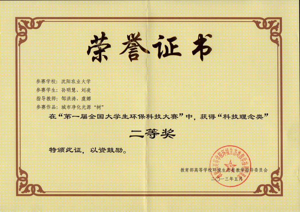 5月31日,第一届全国大学生环保科技大赛在北京林业大学落下帷幕,麻豆网两件参赛作品均获得二等奖,分别是由刘鸣达老师指导的2010级环境科学专业梁佳、2009级环境科学专业张胜完成的“沈阳市东陵公园森林生态系统服务功能价值评估”,以及由邹洪涛老师指导的2010级环境科学专业孙明慧、2010级环境工程专业刘凌完成的“城市净化光源‘树’”。