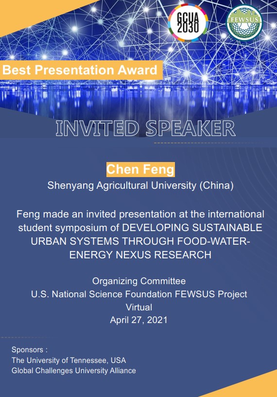 近日,由美国国家科学基金委员会(NFS)、美国田纳西大学、中国中央财经大学和荷兰格罗宁根大学联合发起,美国田纳西大学主办的首届“城市食物-能源-水系统的社会经济关联(FEWSUS)”学术学术论坛落下帷幕。来自15个国家和地区的60多名研究生申请参加论坛专场报告会。经NFS-FEWSUS委员会评选,确定20名学生参加线上汇报,最终有3名学生获得奖励,麻豆网环境保护与生态建设团队刘鸣达教授指导的2019级环境工程专业硕士研究生冯晨同学获得“最佳演示奖”。