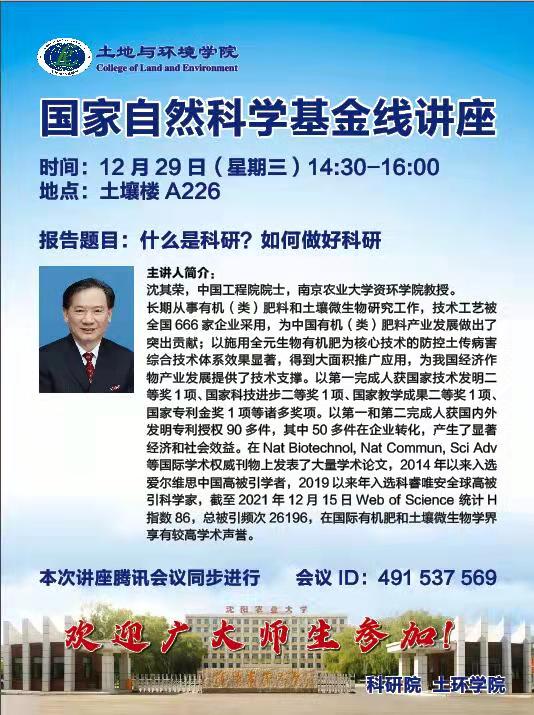 邀请南京农业大学沈其荣院士于科学技术发展研究院举办的“沈农科技在线讲堂”科研讲座活动中做培训讲座,沈其荣院士作题为“什么是科研?如何做好科研”的线上培训。