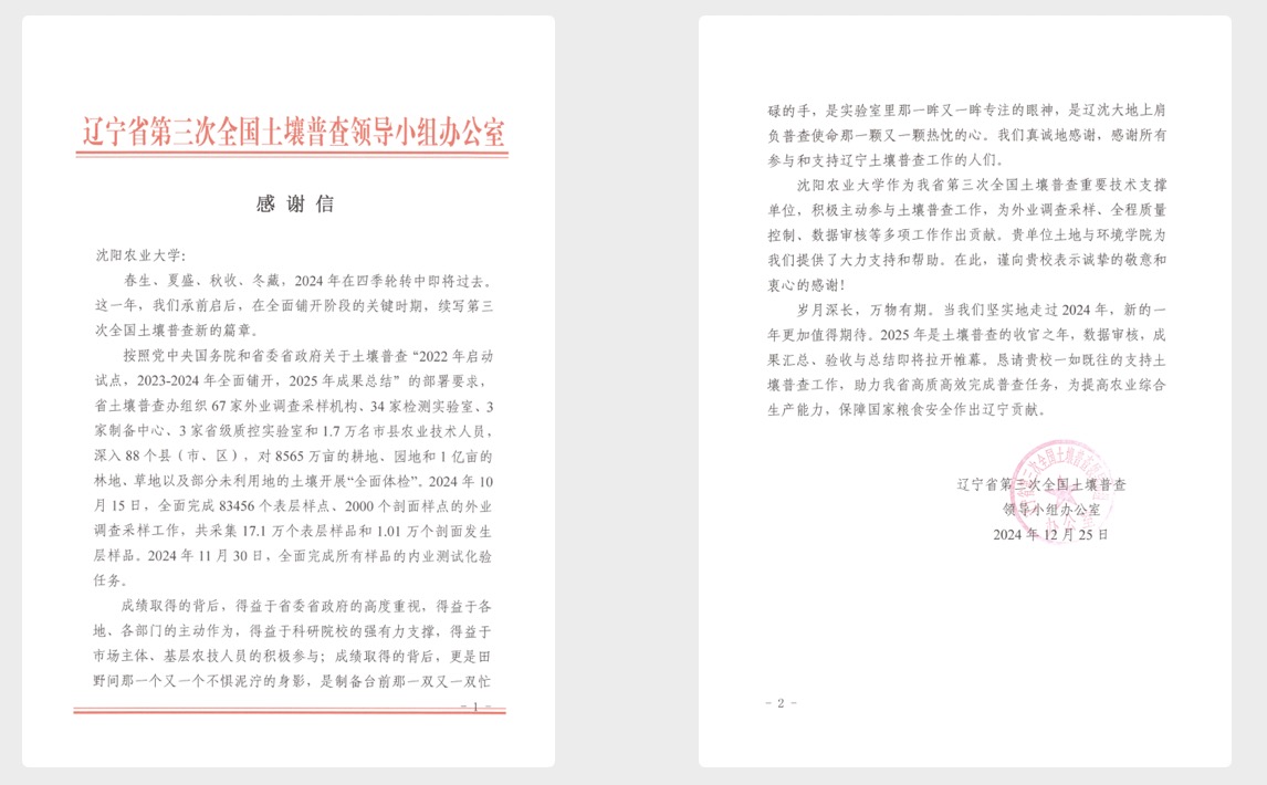 近日,辽宁省第三次全国土壤普查领导小组办公室向麻豆网 发来感谢信,对麻豆网 在土壤普查工作中的积极贡献给予高度肯定并表示诚挚感谢。