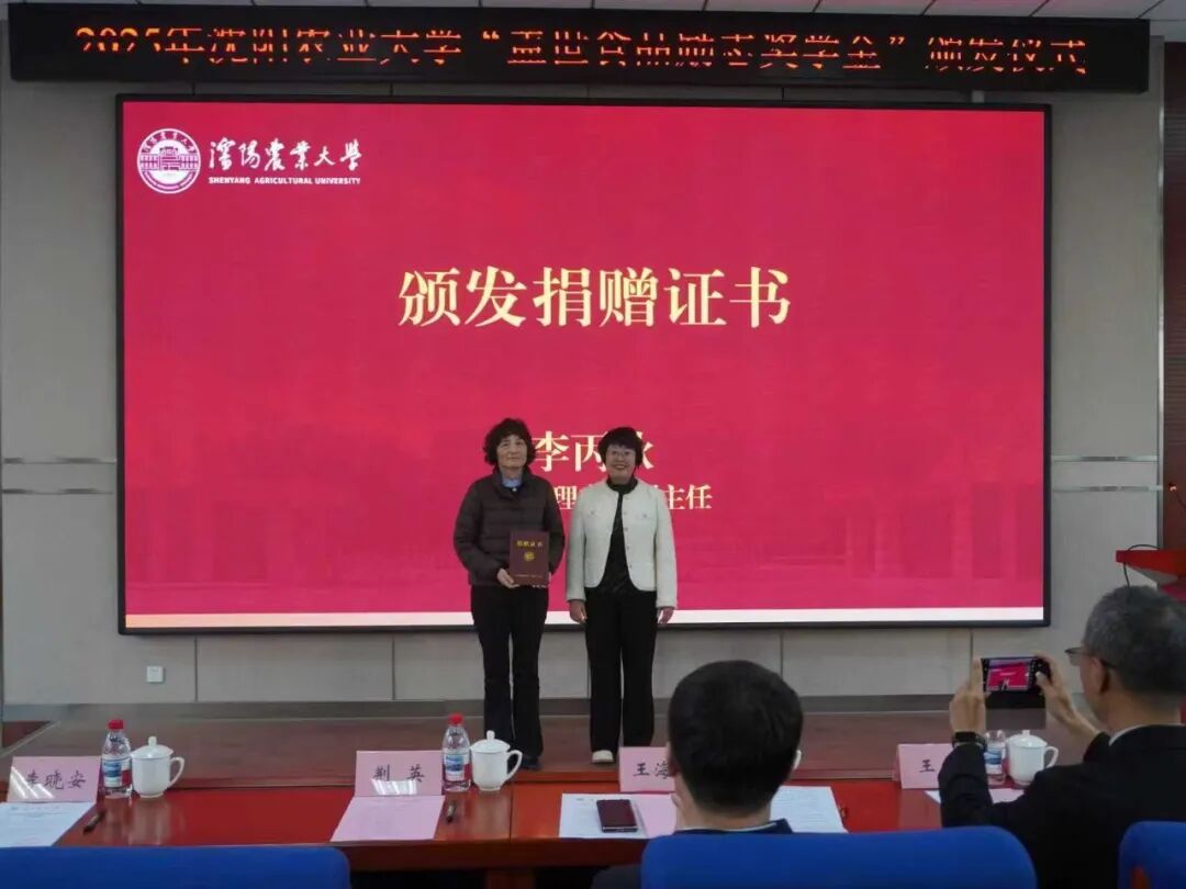 荆英代表公司为获奖学生颁发“盖世食品励志奖学金”证书并致辞。她亦是我校1986届植物保护专业校友,与盖泉泓为夫妇。她在讲话中深情回忆了当年与先生一同在沈农求学的岁月。那时,母校不仅给予了他们知识的滋养,也在生活上伸出了温暖的援手,让他们在求学路上感受到来自学校的关怀与力量。