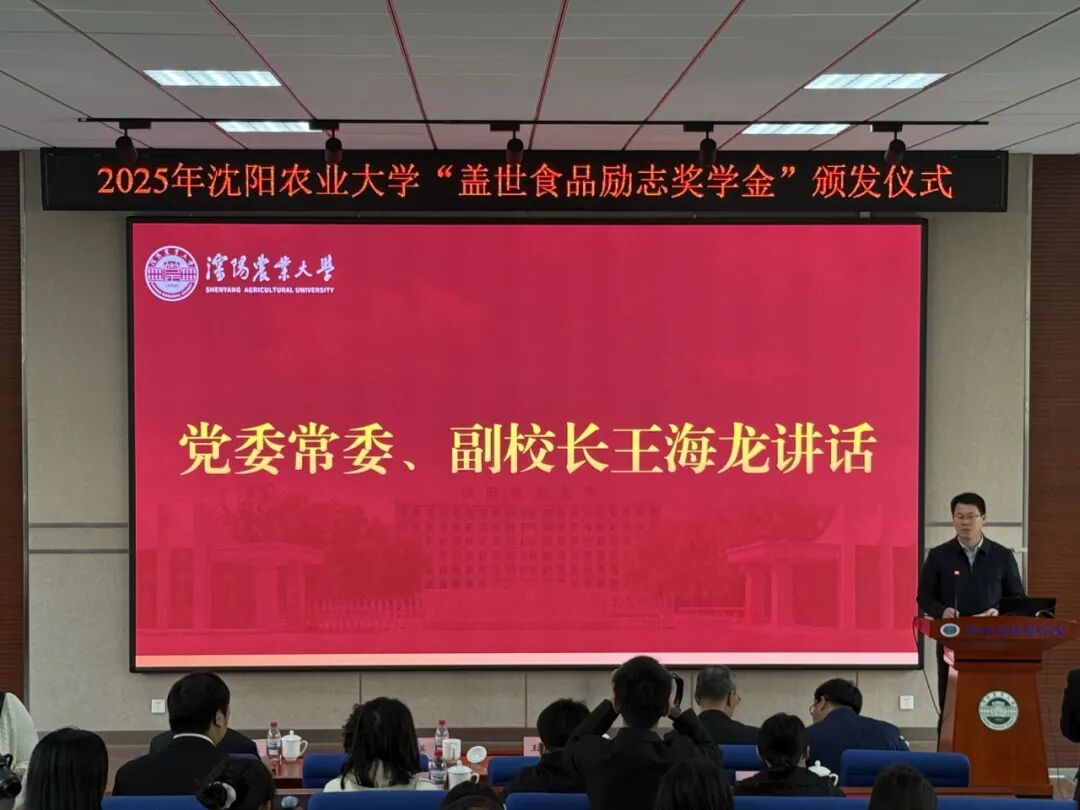 校党委常委、副校长王海龙发表讲话,对盖世食品股份有限公司的爱心捐助表示感谢,并勉励青年学子自立自强、勇于创新,努力成长为担当民族复兴大任的时代新人。