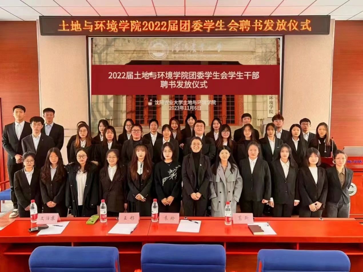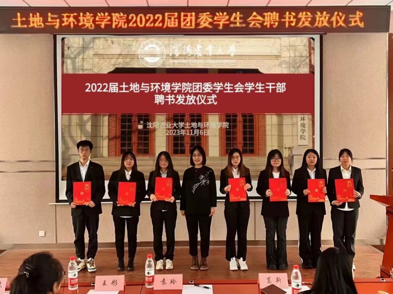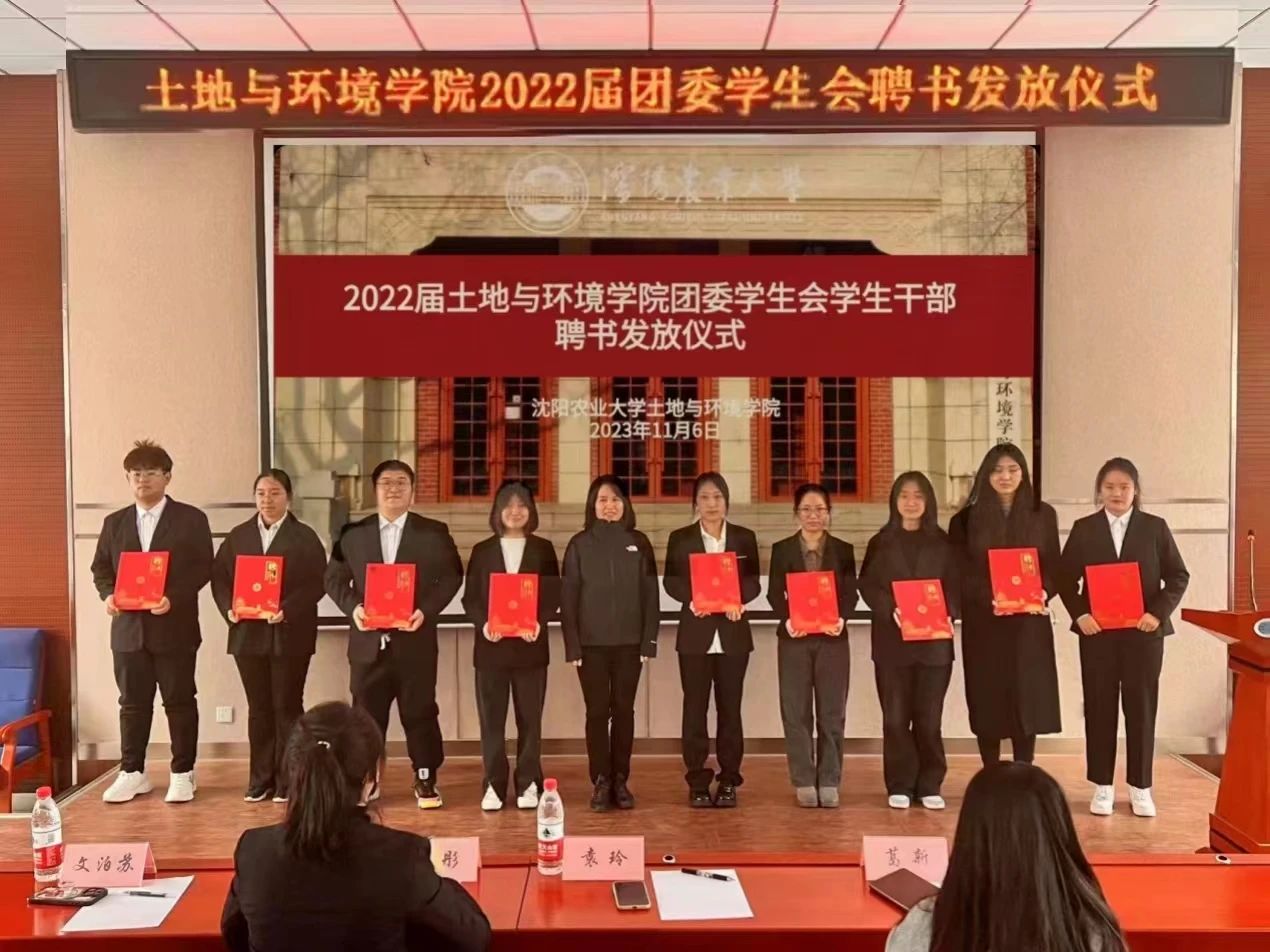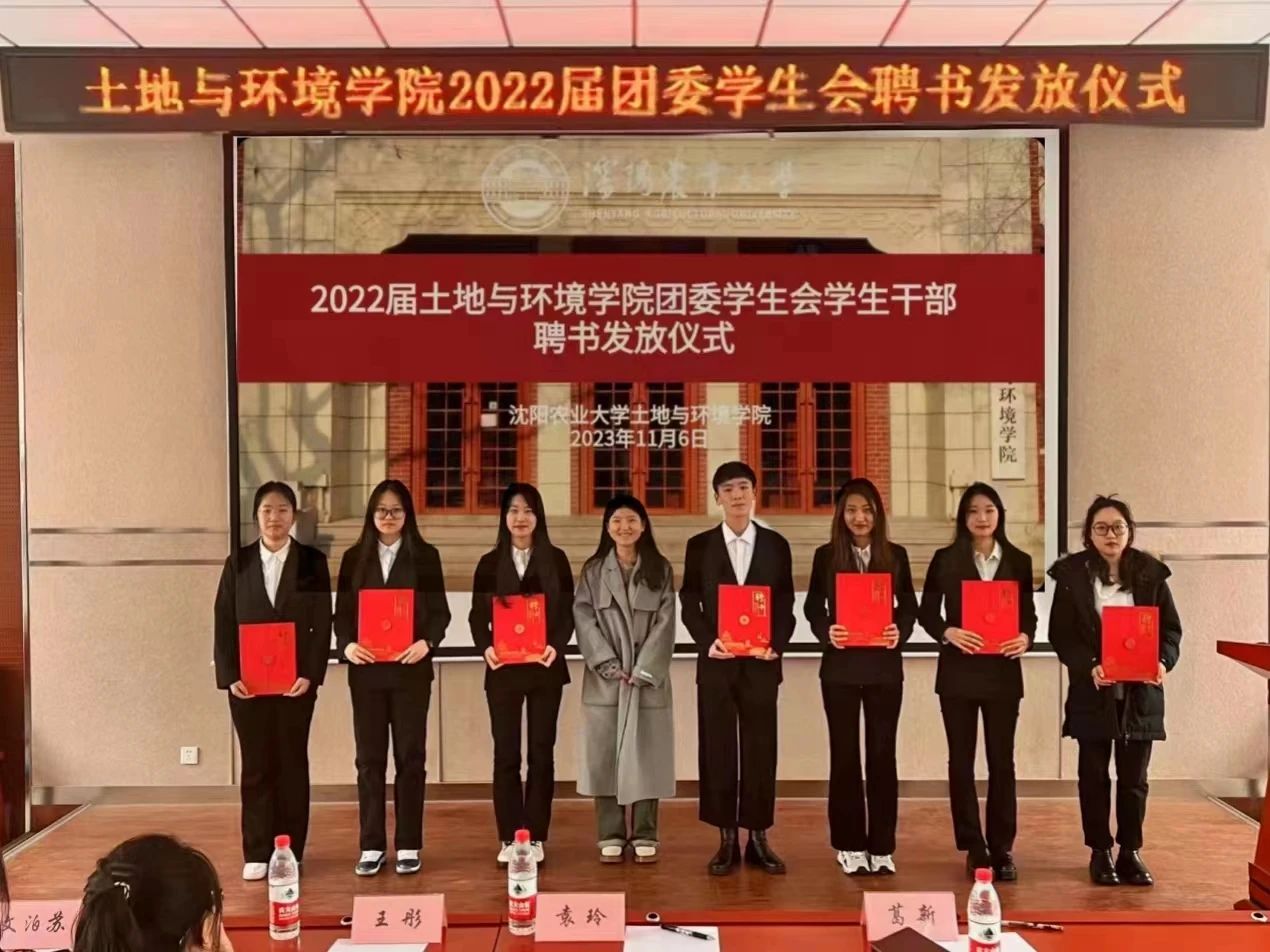 土壤楼A座226会议室进行2022届团委学生会的聘书发放仪式。党委副书记袁玲老师、团委书记王彤老师、辅导员葛新老师、文泊苏老师、2022届团委学生会学生干部、2023届团委学生会学生干部出席本次会议。会议由乐天宇同学主持。