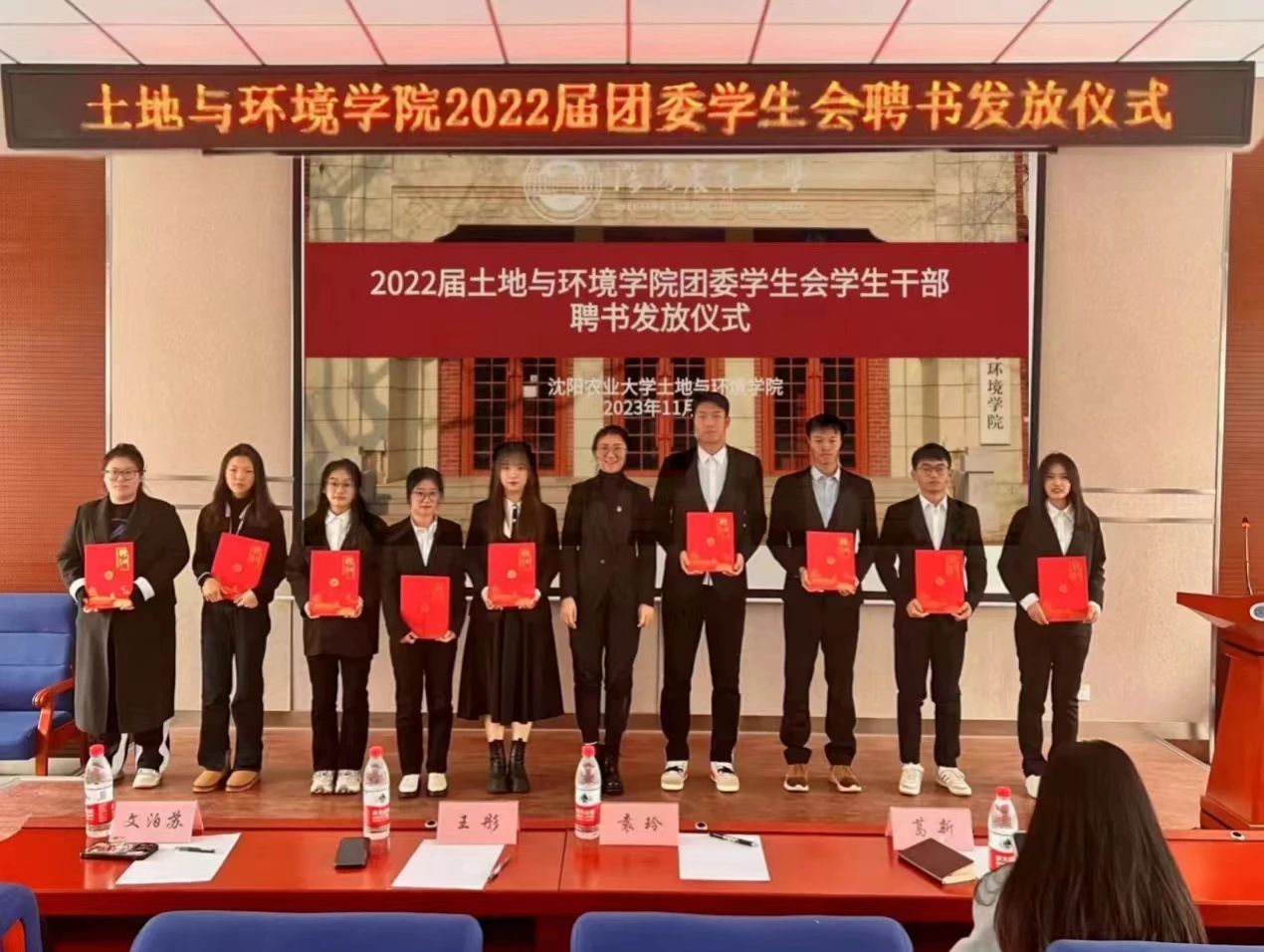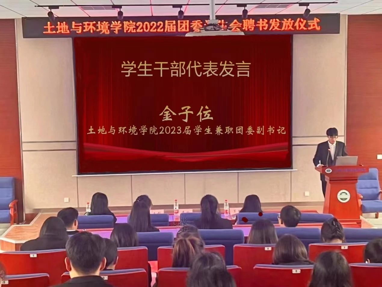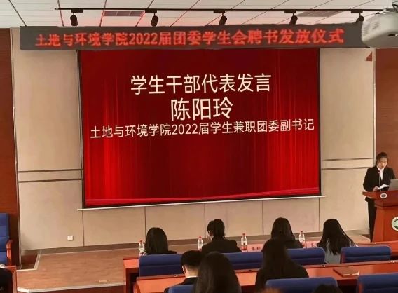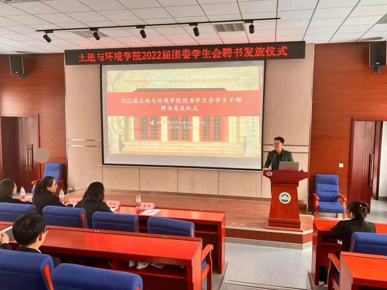 土壤楼A座226会议室进行2022届团委学生会的聘书发放仪式。党委副书记袁玲老师、团委书记王彤老师、辅导员葛新老师、文泊苏老师、2022届团委学生会学生干部、2023届团委学生会学生干部出席本次会议。会议由乐天宇同学主持。