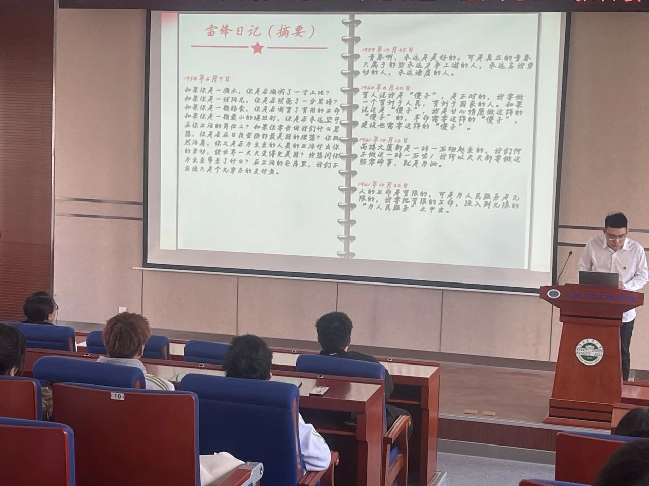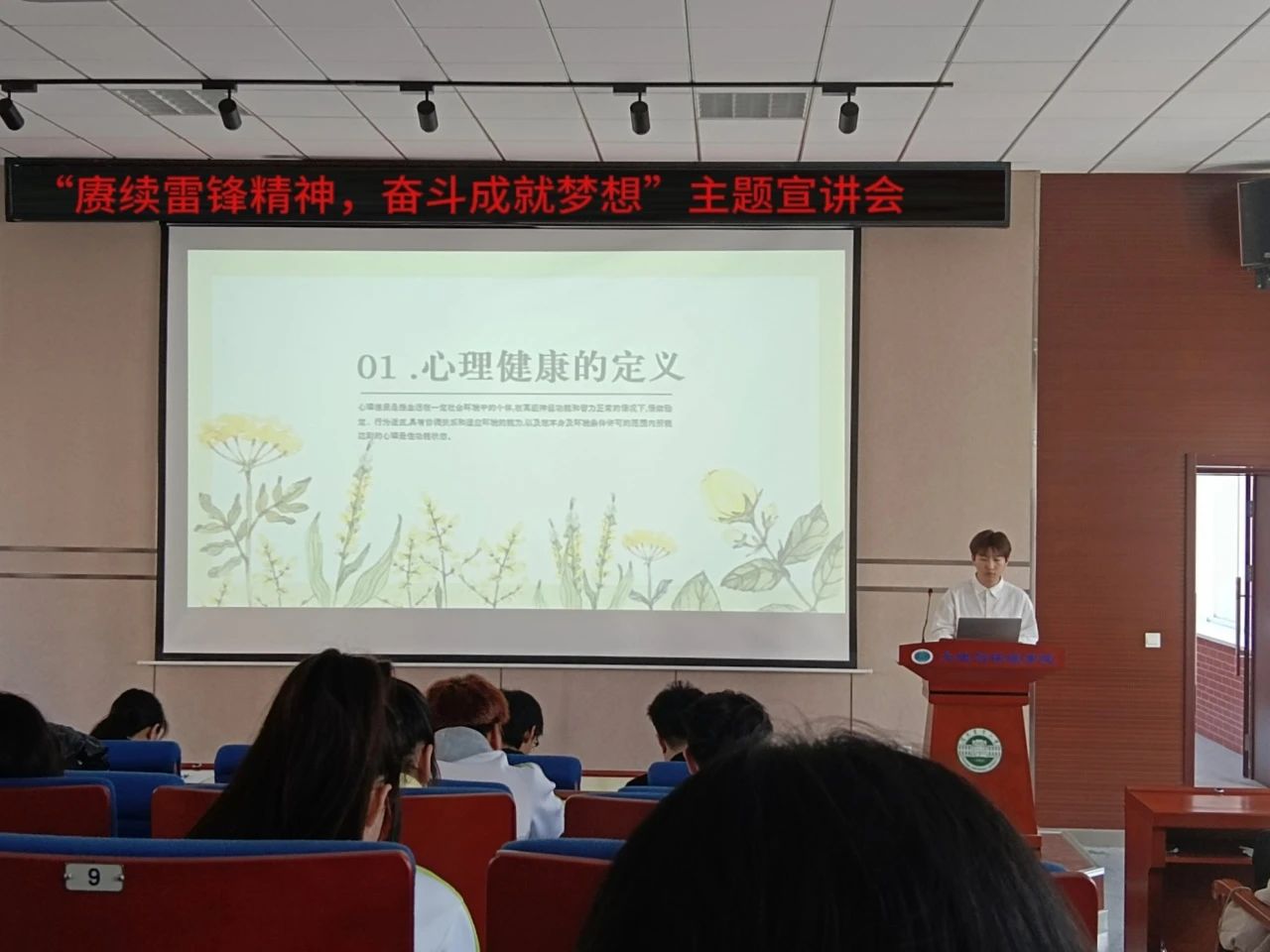 心理建设部马海瑞以《让心灵照进一束光》为主题,为同学们讲解了心理健康教育,并以雷锋精神为指引,学习雷锋无私奉献、乐于助人的精神,内化于心、外化于行,让阳光乐观的精神在我们的日常生活中生根发芽,以更乐观、积极的态度去面对生活的种种挑战。作为土环学子,我们也应自觉传承发扬雷锋精神,立大志、明大德、干大事、成大才,把青春的奋斗奉献与雷锋精神结合起来,勇做时代先锋力量。