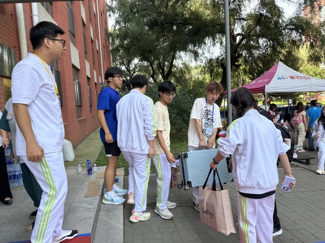 学生志愿者用热情接力,引导每一位新生到达他们的宿舍,一路护航,让他们顺利抵达温馨的宿舍。