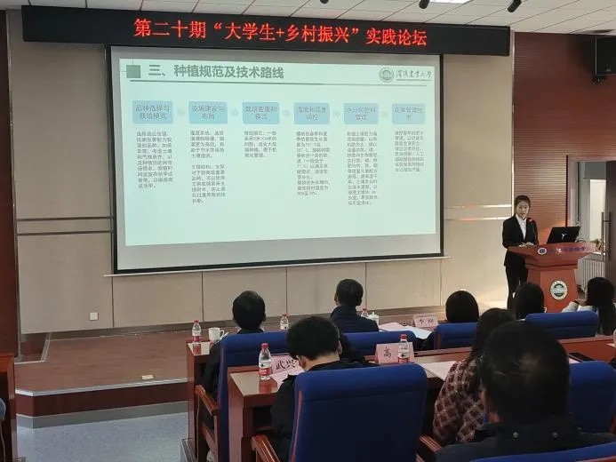 的顺城区调研小组。汇报人进行调研成果分享、视频展示,学生代表针对汇报内容提出问题,汇报人解答,服务乡村振兴博士团成员补充解答。