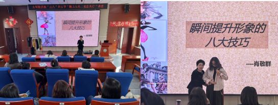 本次活动特邀沈阳市外事服务学校美容美体课程肖敬群老师担任主讲嘉宾。讲座围绕“提升女性形象的八大技巧”展开,从色彩搭配的“631法则”到八大款式廓形的实际应用,深入浅出地将专业美学知识融入教师日常穿搭场景。肖老师结合日常衣橱中常见单品,系统讲解了如何通过基础搭配盘活现有衣物,既通俗易懂,又富有启发性,帮助大家从美学底层逻辑重新审视自身着装形象。